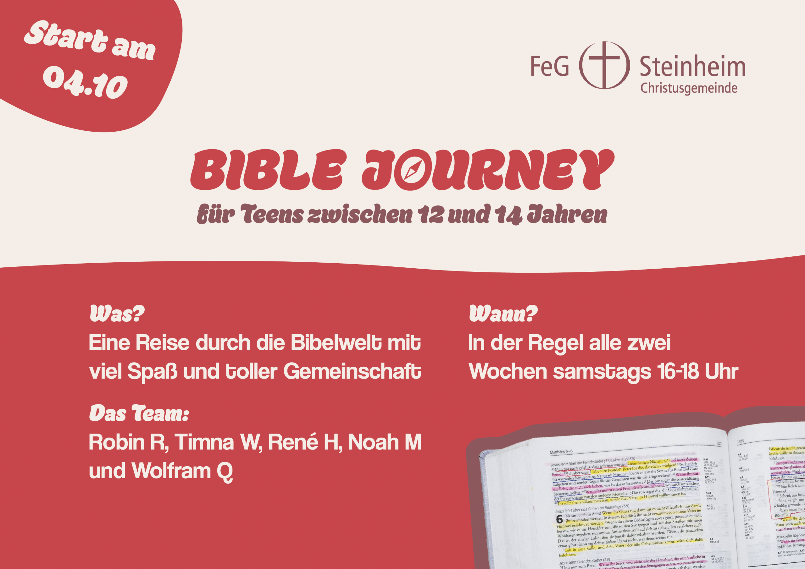 Weißt du was? Wir wollen super gern eine Reise mit dir machen! BibleJourney ist eine neu entstehende Gruppe für 12-14-Jährige, in der wir genau das erleben wollen. Okay, wir steigen in kein Flugzeug, werden aber trotzdem viel sehen und erleben.