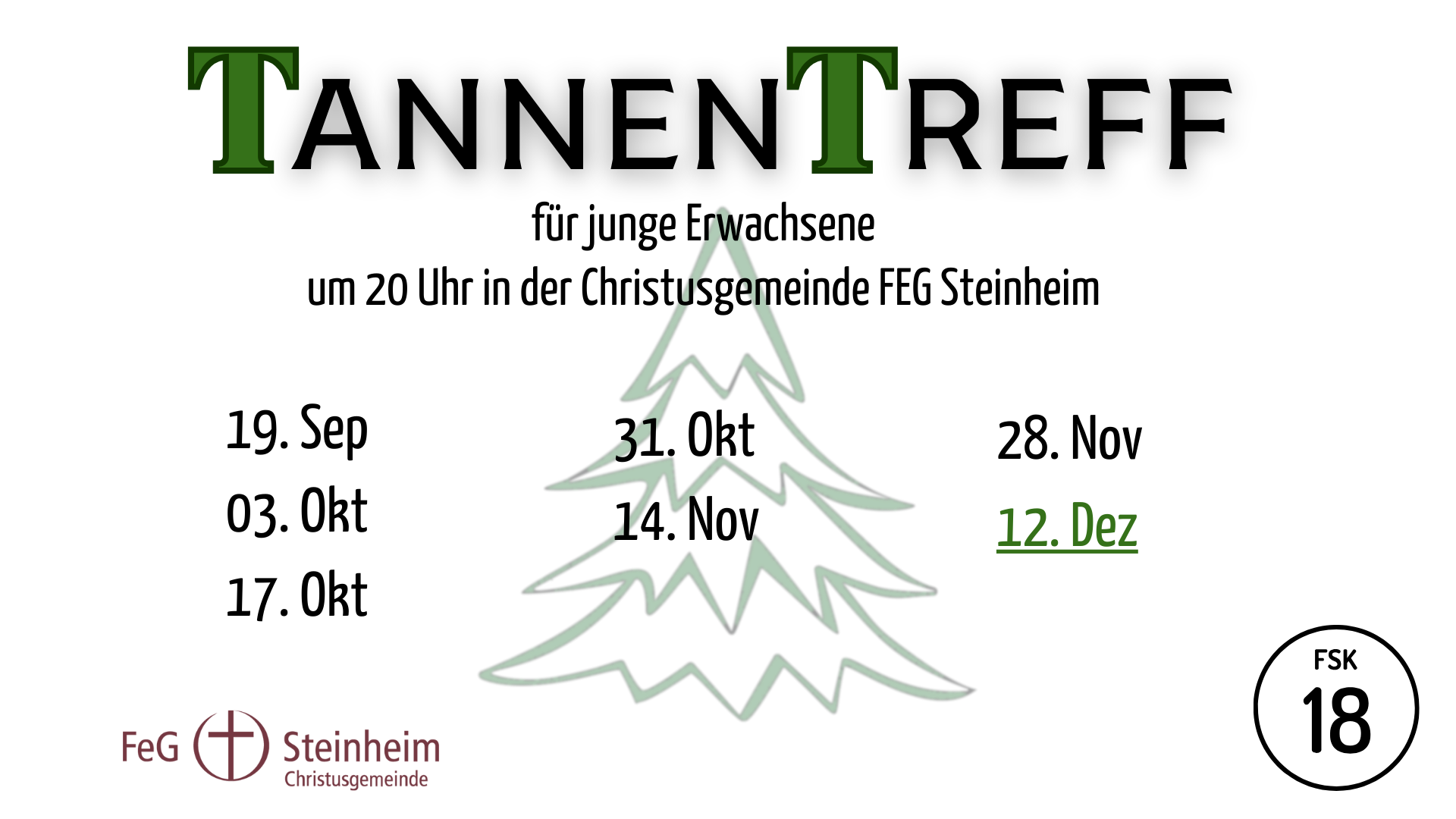 Ganz frisch starten wir – in Ergänzung zur großen Pfadfinderarbeit – eine neue Jugendgruppe: „Tannentreff“ für junge Erwachsene ab 18 Jahren. Neben Action, Spielen, Snacks, Musik und Gemeinschaft, wird es auch Impulse und Diskussionen zu aktuellen und Lebensthemen geben. Die Schwerpunkte sind dem aktuellen Programm zu entnehmen.