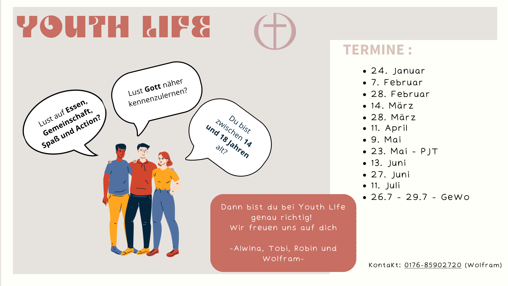 Außerdem planen wir ein paar Specials, wie Übernachtungen im Gemeindehaus und mindestens eine Freizeit. Ansonsten treffen wir uns etwa alle 2 Wochen samstags 16-18 Uhr für ein gutes Jahr.